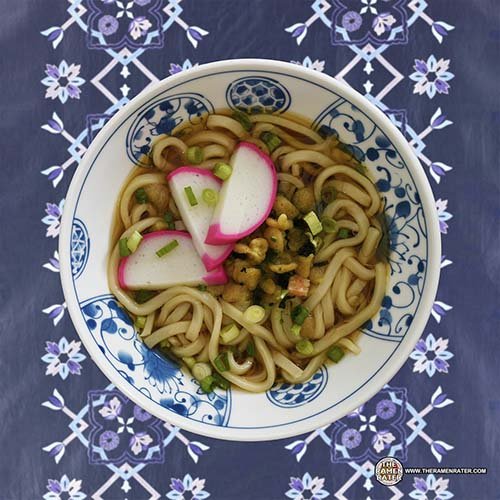 Finished (click to enlarge). Added green onion and kamaboko. Udon had a flatter shape than most of the fresh pouch varieties usually do. Aside from that, nothing different here I could find. The broth was good – not such a sweetly flavored showing but more savory with better fish taste. Included garnish is vegetable and tempura was good. 3.5 out of 5.0 stars. EAN bar code 8801068090314.